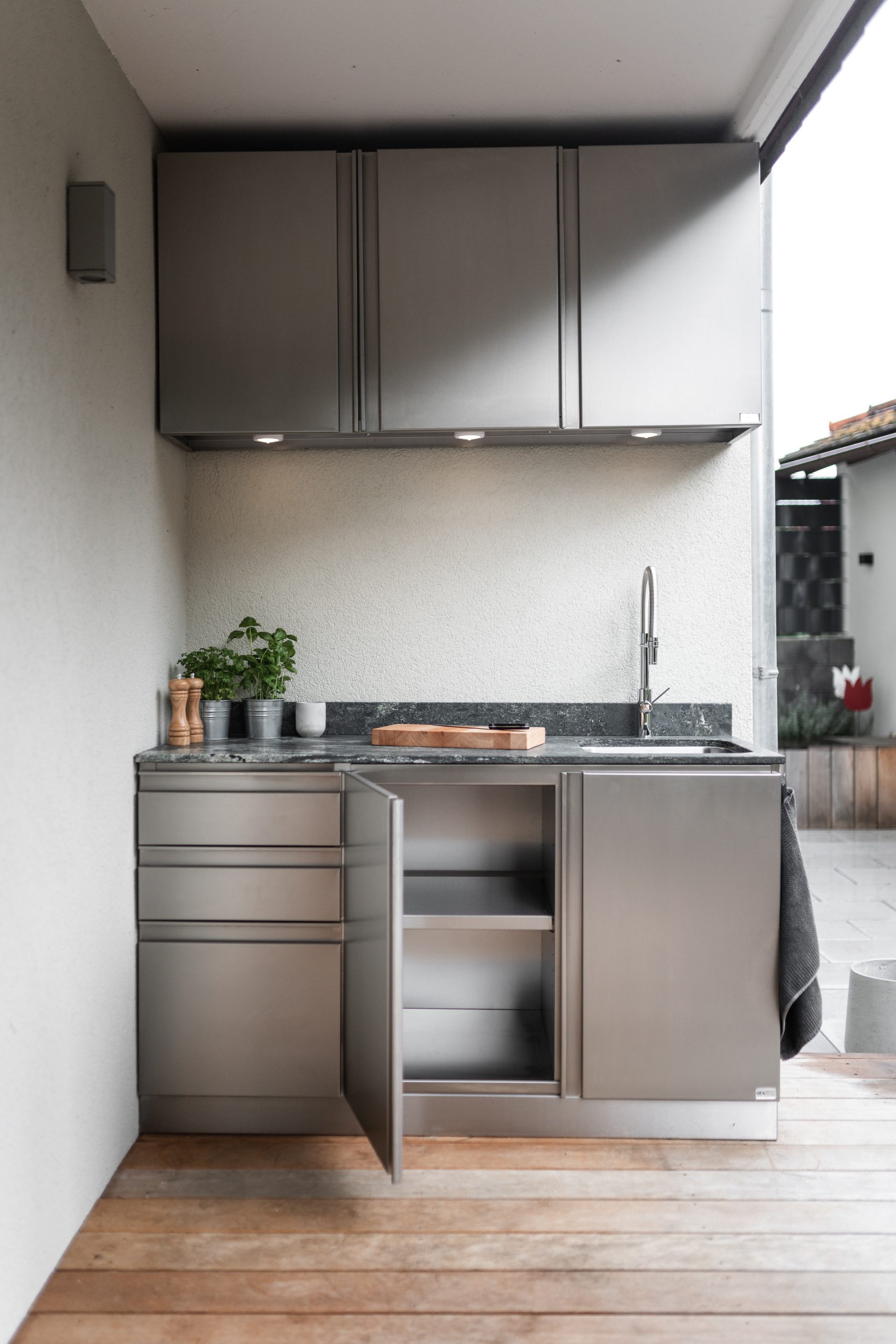 Spüle und Armatur aus Edelstahl, wetterbeständig, funktional und stylisch.